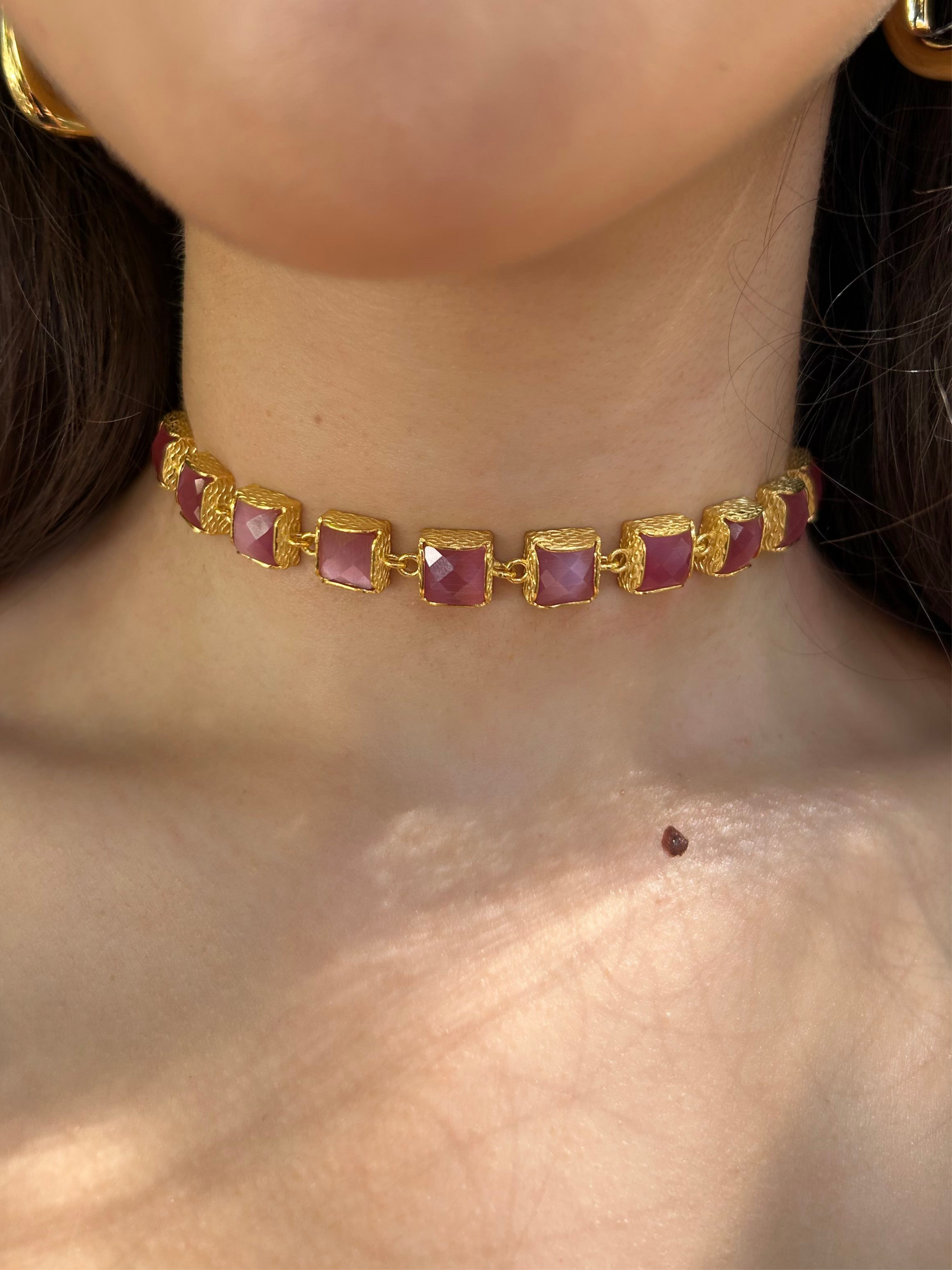 Este chocker está hecho a mano en latón bañado en oro de 18k y piedras naturales de cuarzo rosa.